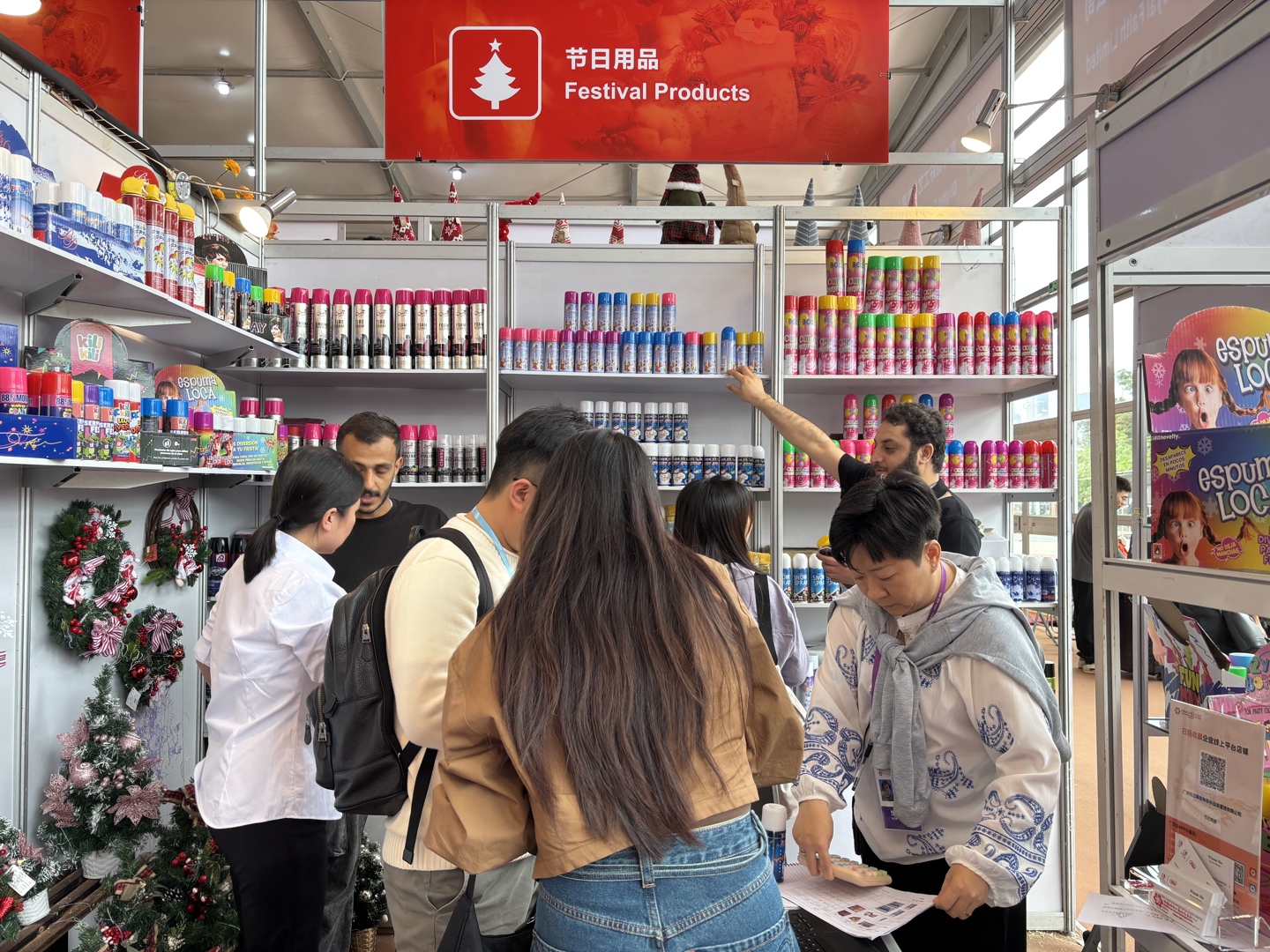 积极响应全球可持续发展趋势,轻出公司在本届展会上将绿色低碳设定为核心战略。特别是在节日派对气雾剂产品线方面,公司实施了全面的技术升级。不仅对喷雪、彩带、喇叭等核心产品的成分进行更新,调配出更契合欧美市场标准的配方,还全新推出了环保玉米喷粉等创新装饰产品。开展第一天,便接待了来自印度、埃及、俄罗斯、秘鲁等国家近40外商